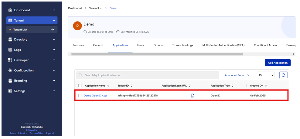 - Go to Tenant > Tenant List and select the specific tenant where the application needs to be created.
